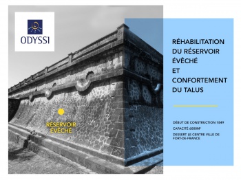 ODYSSI procédera à des travaux de renforcement de la distribution en eau potable dans la semaine du 8 février 2021. Ces travaux d'un coût de 3M€HT sont destinés à améliorer et à sécuriser, à terme, la distribution d'eau potable dans le centre-ville de Fort-de-France. Ils consistent à réhabiliter le réservoir Evêché, bâtiment inscrit à l'inventaire des Monuments Historiques.